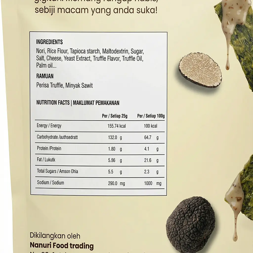 Elevate your snacking standards. Nanuri Supreme Truffle Nori Chips brings the earthy, aromatic elegance of fine dining into a convenient snack pack. Truffle is known as the “diamond of the kitchen,” and we have dusted it generously over our premium Nori.